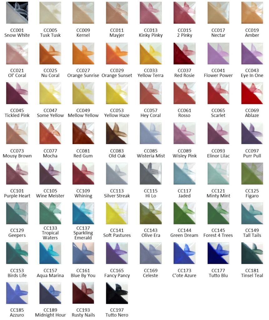 The Café Colours are the most spectacular range of bright coloured glazes that we manufacture and are available in three series; two low fire versions that are satin or glossy at Cone 06 (999°C) and Cone 04 (1,060°C) and a high fire version.