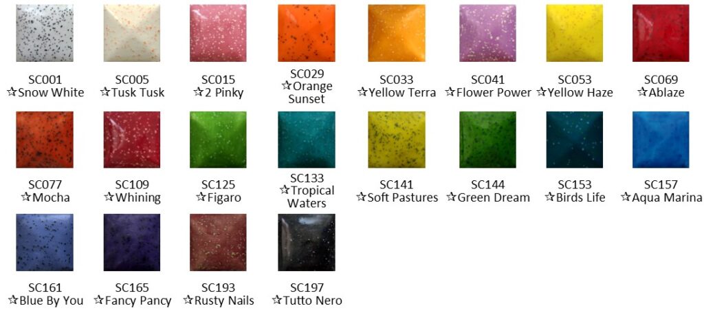 The colours in the range match up with the Cafe Colours of the same name. To distinguish them from the Cafe Colours, the code has been prefixed with “SC” followed by the number and the name has been prefixed with a “☆”.
